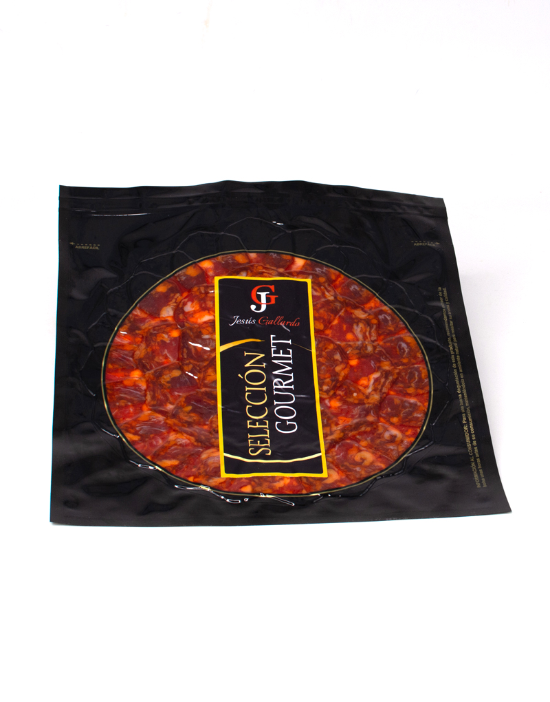 Disfruta del auténtico sabor del chorizo de bellota ibérico natural, elaborado con carne seleccionada de cerdo ibérico alimentado con bellotas durante la montanera. Su curación lenta y natural resalta su sabor profundo, equilibrado y ligeramente especiado. Presentado en finas lonchas de 100 gramos, es perfecto para disfrutar en tapas, bocadillos o como parte de una tabla de embutidos. Un bocado de tradición ibérica, lleno de sabor y calidad natural en cada loncha.