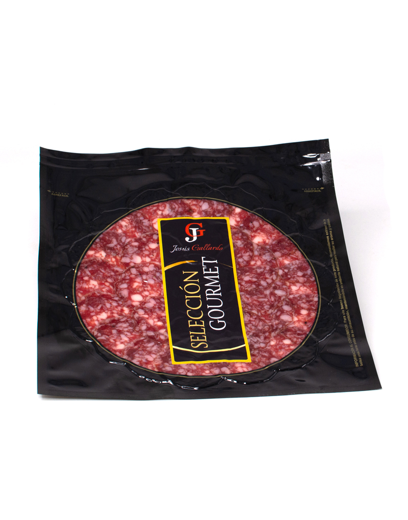Delicioso salchichón de bellota ibérico natural, elaborado con carnes nobles de cerdo ibérico alimentado con bellotas y curado de forma tradicional sin aditivos artificiales. Su sabor suave, ligeramente especiado, y su textura jugosa lo convierten en un embutido imprescindible en cualquier tabla gourmet. Presentado en finas lonchas en un sobre de 100 gramos, listo para servir y disfrutar en cualquier momento. Autenticidad, calidad y sabor ibérico en cada bocado.